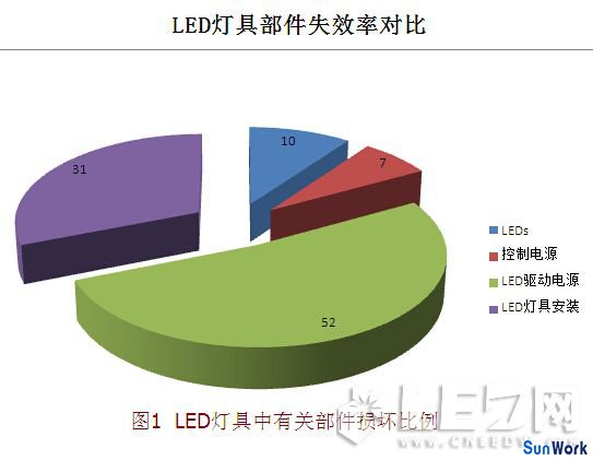 LED燈具中有關(guān)部件損壞比例如圖1所示,其中,LEDs的損壞率為10%,控制電路為7%,LED燈具的安裝為31%,LED驅(qū)動(dòng)器為52%??梢娫贚ED燈具中LEDs的損壞率并不高,LED驅(qū)動(dòng)電路失效率相對較高為52%,LED燈具失效90%并非來自LED(數(shù)據(jù)來源:Appalachian Lighting Systems)。該數(shù)據(jù)的統(tǒng)計(jì)條件是在5400件LED燈具中失效燈具為29具(失效率為:0.54%)的實(shí)驗(yàn)條件下進(jìn)行的。