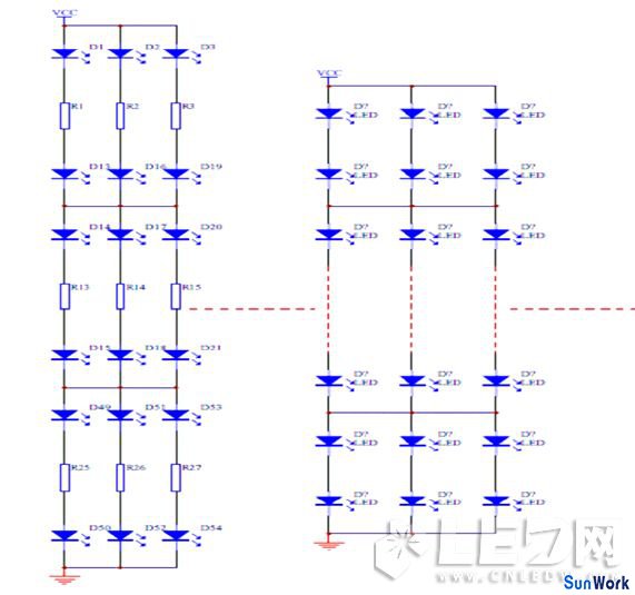 LED因其VF值特性原因做不到相同,隨著溫度及電流大小也有些VF值也會發生變化,一般不適合并聯設計。但是有些情況又不得不并聯解決多顆LED驅動成本問題,這些設計可以為大家做些參考。