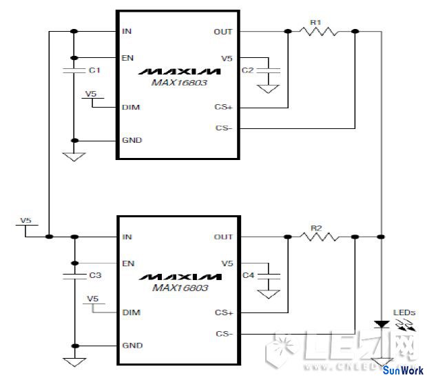 像這種檢測在LED的一端LED恒流驅動IC也可以并聯設計驅動,實際上IC是單獨工作的,最后在并流一起。DC-DC方式是工作在較高的頻率上,需要注意的是PCB布板時避免交叉設計,各自濾波、旁路電容要緊靠IC附近,負載電流最后會和即可。