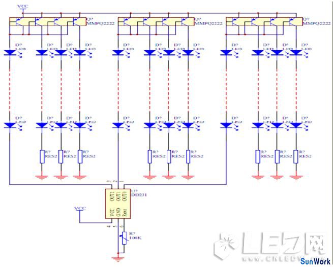 下圖采用集成三極管可以保持每路LED電流一致,這些三極管在相同溫度環境下、相同工藝條件生產出來的β值一樣,可以保證每路電流基本一樣。恒流部分在要求不是很高的條件下可以這樣設計,穩定的電壓或穩定的PWM伏值驅動穩壓后的三極管偏壓,做到基本恒流。