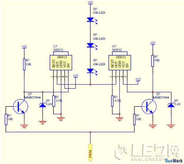 下圖采用DD312并聯參考設計直接驅動3顆6W LED。使能PWM控制信號需要適當的隔離,避免相互干擾和驅動能力問題。EN使能電壓要符合規格書要求,不要電壓太高損壞EN腳。一般IC耐壓是指負載和電源,沒有注明激勵電壓請不要大于5V設計。