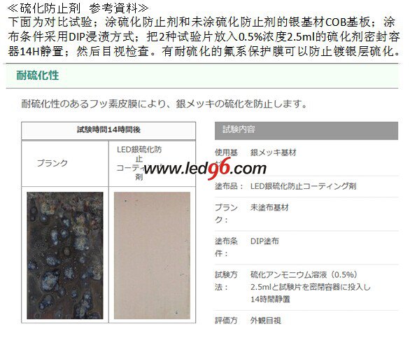 COB光源由于其優越的性能表現在LED照明產業得到廣泛的應用;但COB光源有個令人頭疼的問題;就是COB光源高反射鍍銀基板在使用過程中;銀層會硫化發黑;導致光衰嚴重;如何解決這個技術難題;目前業界還在做各種測試;日本LED業界目前開發了一種新型的防硫化劑技術;在封裝好的COB光源表面通過浸漬方式形成一層幾微米厚的硫化保護層(另外具有防腐蝕;防潮防濕性能);來防止COB光源由于硅膠的透濕透氣導致外部使用環境中的硫化物侵入;產生高反射基板鍍銀層硫化發黑;光衰嚴重;失效和死燈的問題。硫化試驗結果表明;有防硫化保護涂層的和沒有保護涂層的結果截然不同。